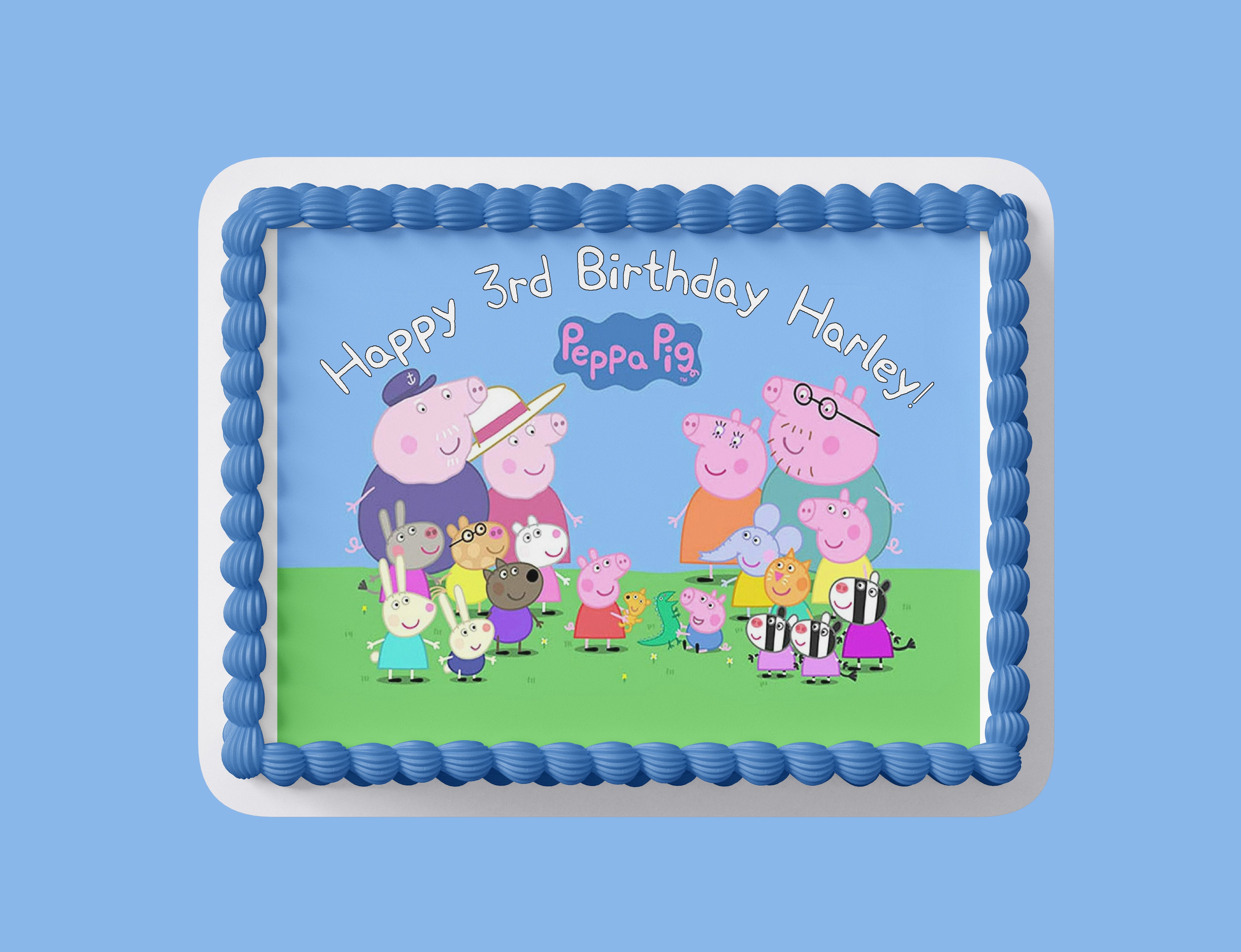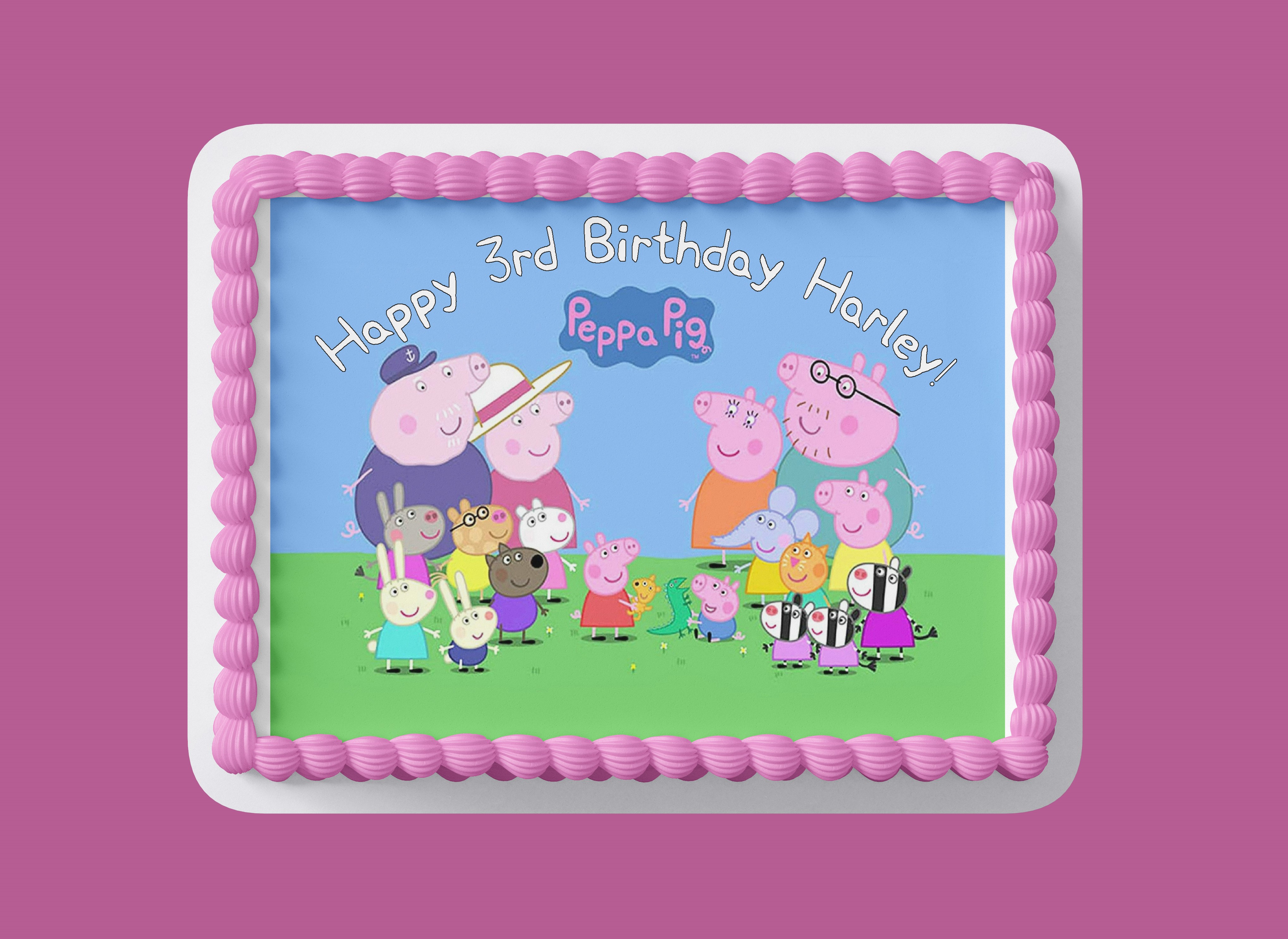 This is a custom edible image cake topper which is a thin frosting sheet that will fit a quarter sheet cake. (print area 7.5" x 10.5") Apply directly to the buttercream iced cake. Allow an hour to melt into the buttercream (May have to dab the buttercream to moisten/freshen before applying the topper)