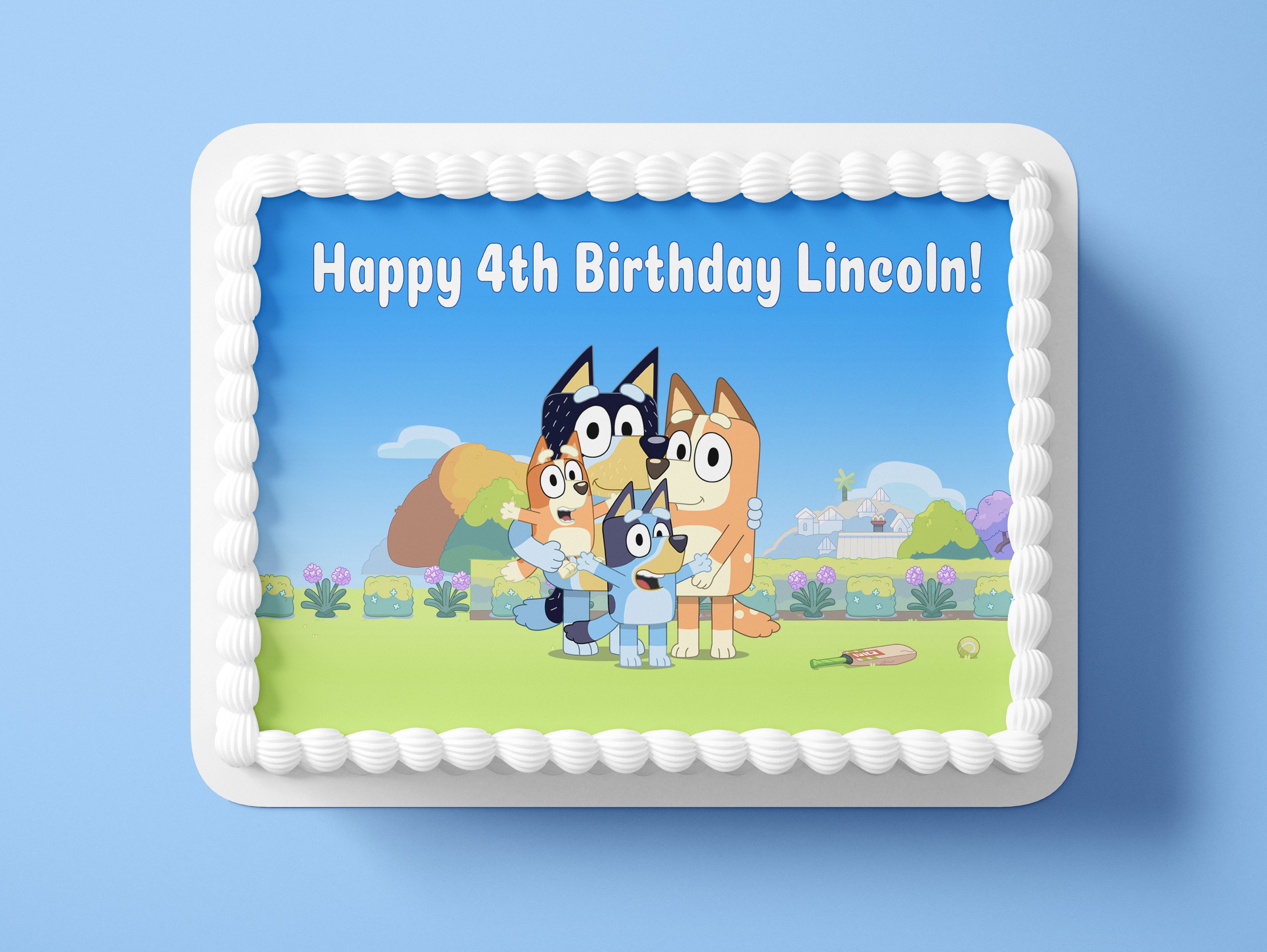This is a custom edible image cake topper which is a thin frosting sheet that will fit a quarter sheet cake. (print area 7.5" x 10.5") Apply directly to the buttercream iced cake. Allow an hour to melt into the buttercream (May have to dab the buttercream to moisten/freshen before applying the topper)