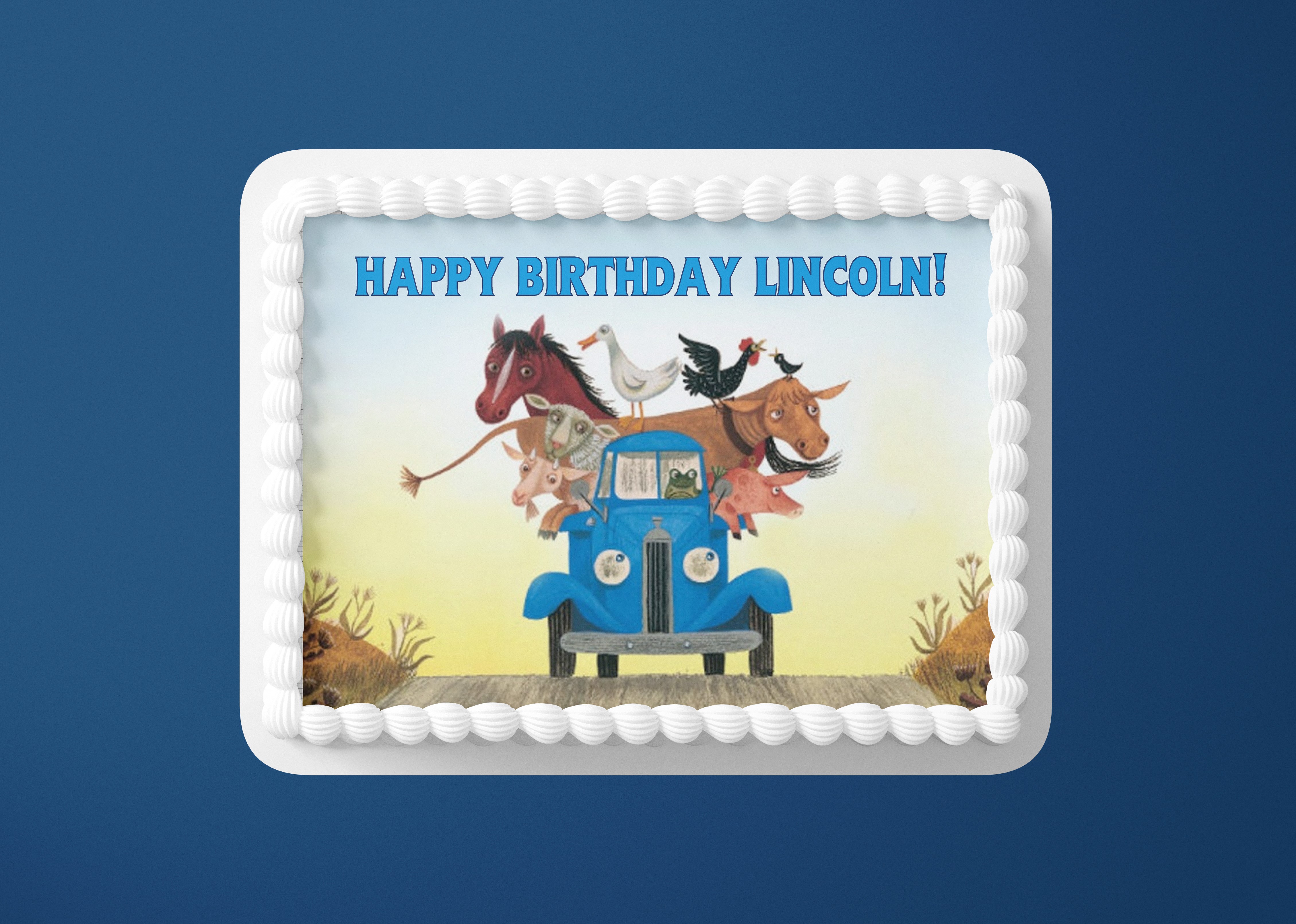 This is a custom edible image cake topper which is a thin frosting sheet that will fit a quarter sheet cake. (print area 7.5" x 10.5") Apply directly to the buttercream iced cake. Allow an hour or two+ to melt into the buttercream (May have to dab the buttercream to moisten/freshen before applying the topper) The more moist the layer underneath, the faster it will melt down ino it.
